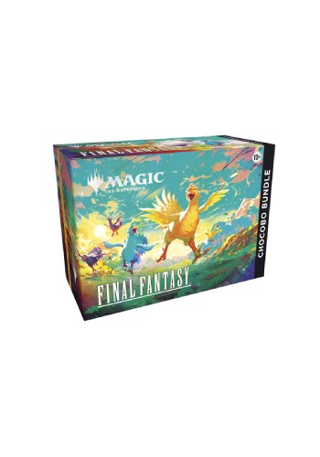 CONTEÚDO DO CHOCOBO BUNDLE — Dez Play Boosters com 14 cartas, um Chocobo Booster com 12 cartas, 1 carta promocional foil tradicional com arte alternativa, 1 das 24 Scene Cards, 32 Terrenos Básicos (16 foil tradicionais, 16 regulares), um marcador de vida Click Wheel especial e uma caixa de cartas Chocobo Edition.