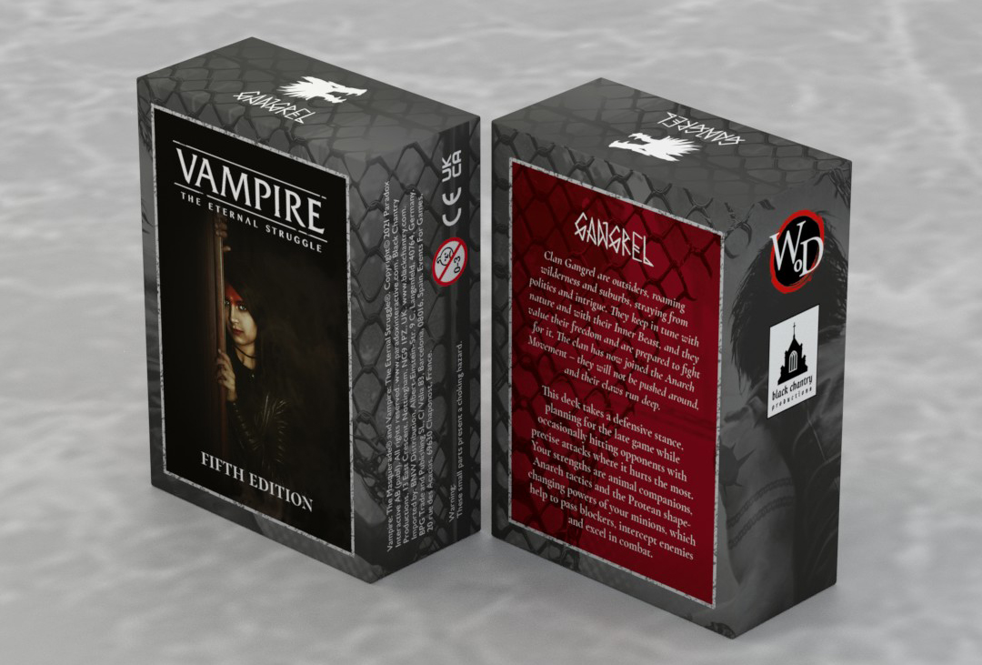 This is a deck with 77 library cards and 12 crypt cards, ready for play out of the box or customizable with other Vampire: The Eternal Struggle cards. Each player needs a deck to play.